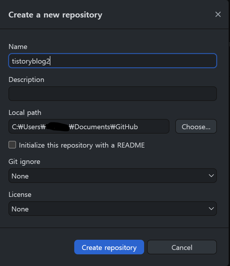 2. 만들어줄 Repository 이름을 넣어주고 하단에 Create repository를 눌러주면 내 로컬 컴퓨터의 Github 폴더에 앞서 지은 Repository 이름의 폴더가 생기는 것을 확인할 수 있다. (tistoryblog2라는 이름으로 Repository를 만들어서 tistoryblog2라는 폴더가 생겼다.)