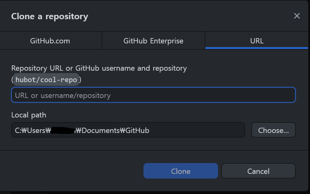 3. 위쪽에 보이는 링크를 복사 한 후에 Github Desktop -> Current repository -> Add -> Clone repository를 눌러주고 URL을 붙여넣는다. 그러면 내 로컬 컴퓨터의 Github 폴더에 앞서 지은 Repository 이름의 폴더가 생기는 것을 확인할 수 있다. (tistoryblog라는 이름으로 Repository를 만들어서 tistoryblog라는 폴더가 생겼다.)