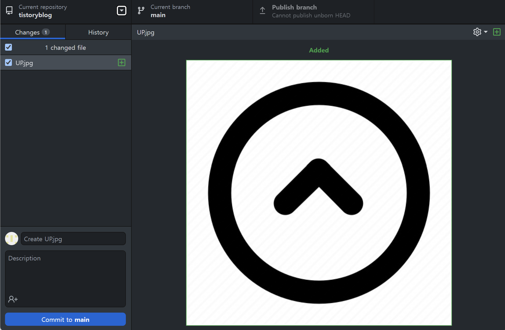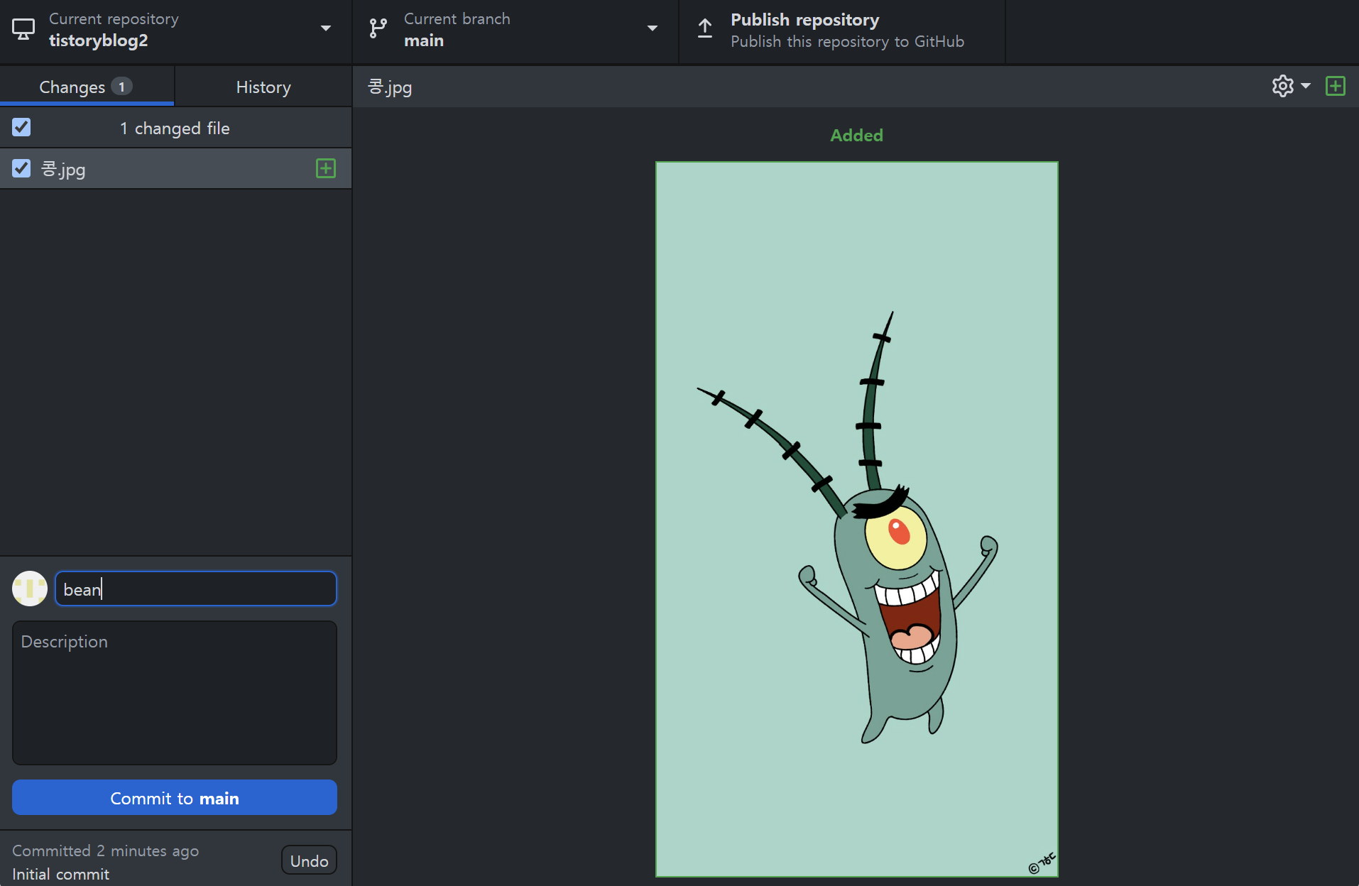 4. 그 폴더에 commit 하고자 하는 파일을 넣어주면 Github Desktop에서 changes를 통해 해당 폴더에 변화가 생긴 것을 확인할 수 있다. 왼쪽 하단 동그라미 옆에 파일에 대한 설명을 써주고(선택) Commit to main을 누르면 Current branch main에 Commit되고 최종적으로 Github 페이지에도 넣으려면 Publish branch를 해주면 된다.