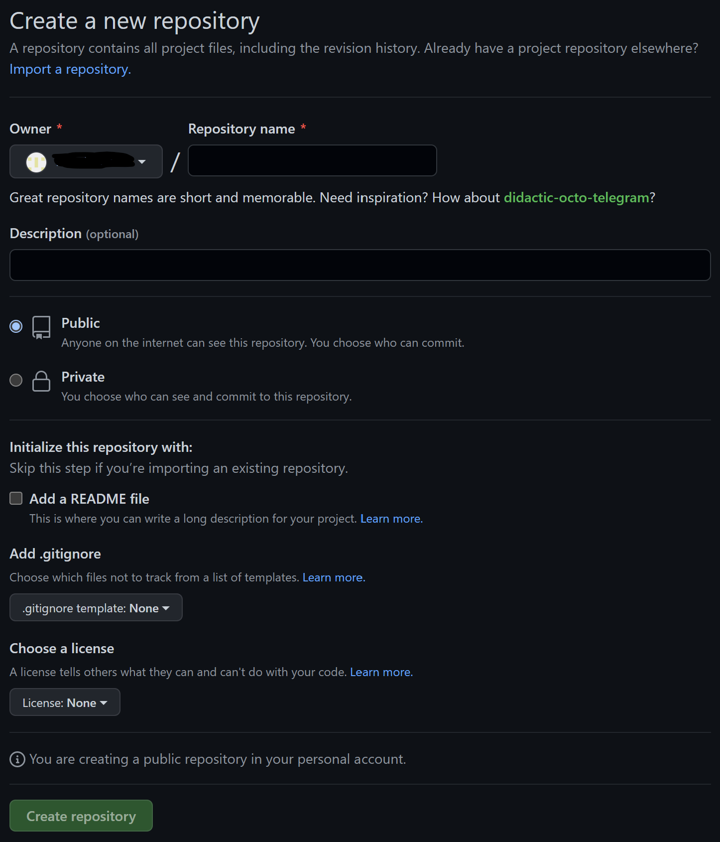 2. 빨간 별표시가 되어있는 Repository 이름을 지어주고 Repository를 Public(공개), Private(비공개)로 할지 선택해 주고 하단의 녹색 Create Repository를 눌러준다.