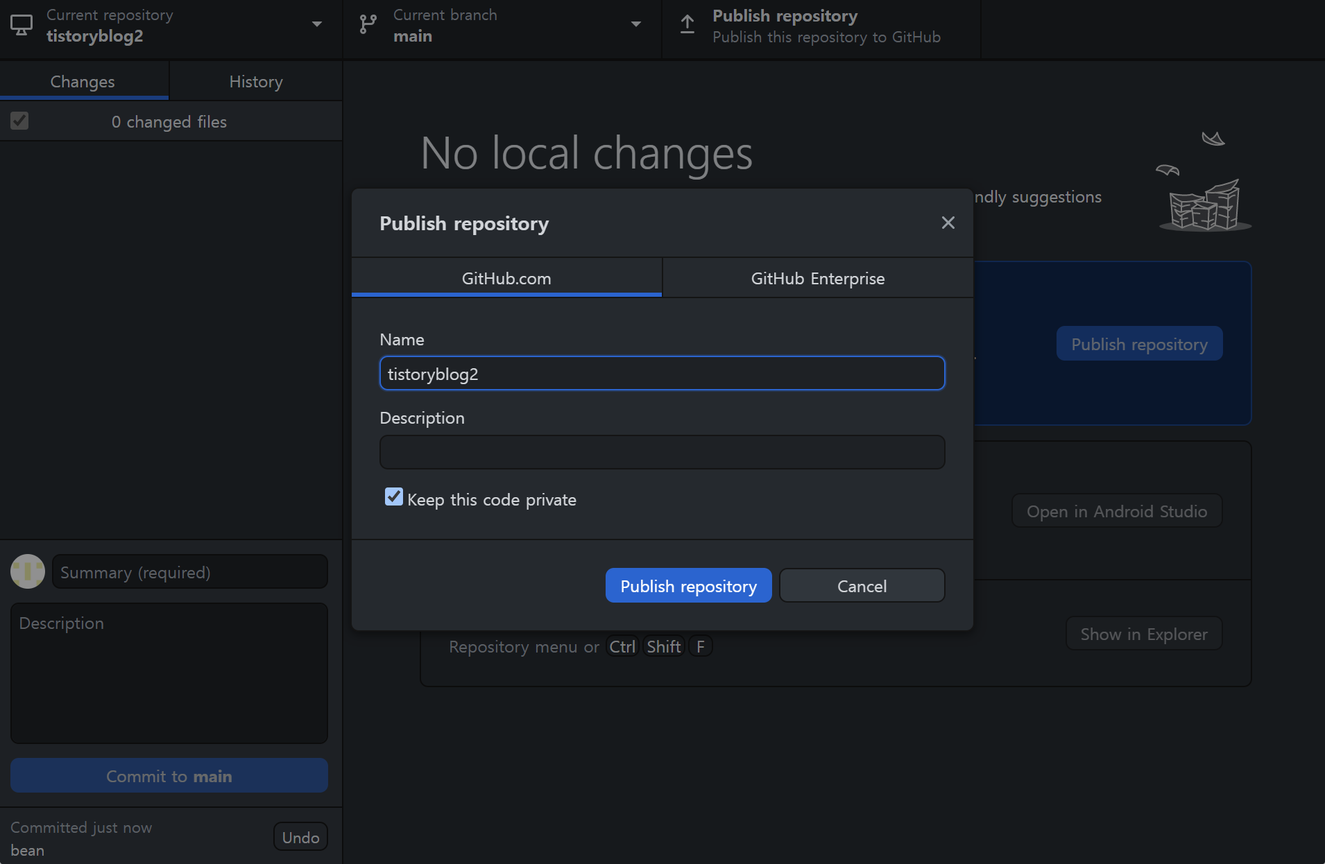 3. 여기서 위와 같은 방식으로 Commit to main 버튼을 눌러주고 Publish repository를 눌러주면