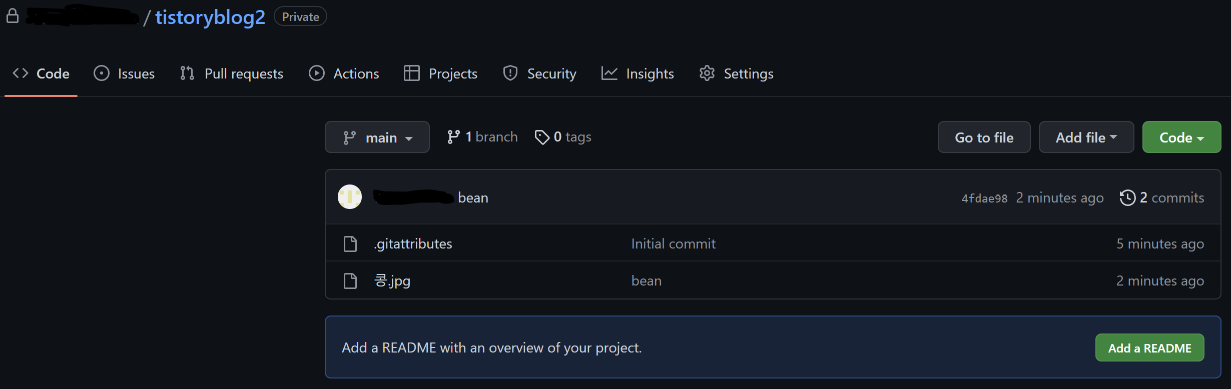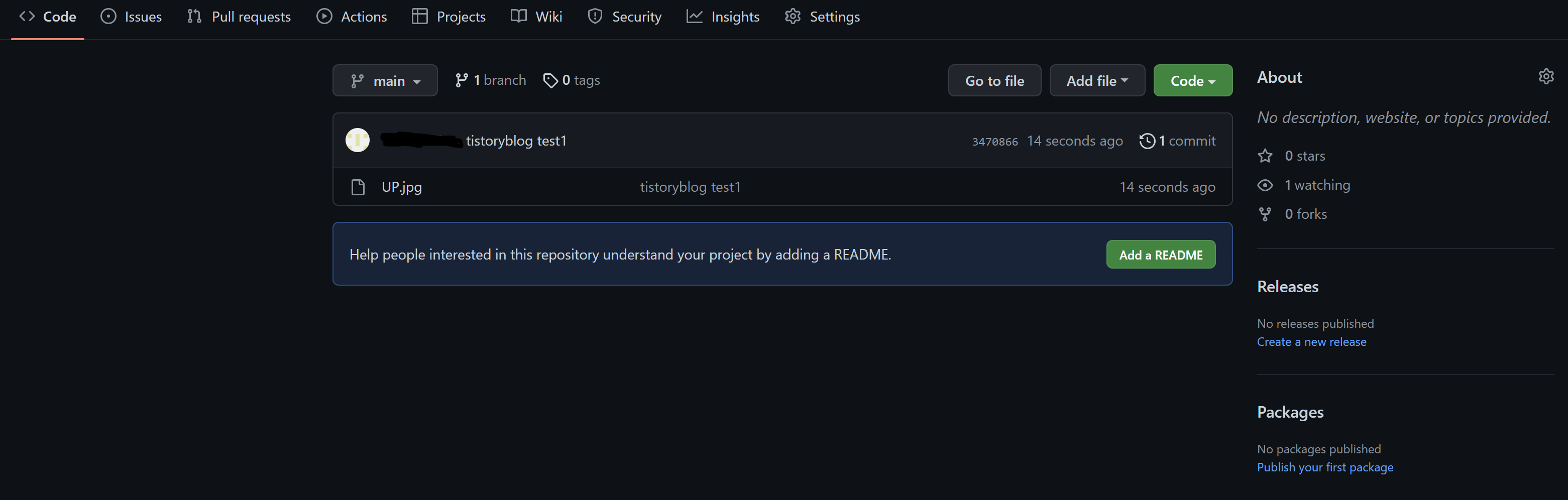 5. 위와 같이 Repository가 생성됨과 동시에 파일도 push 되는 것을 확인할 수 있다.