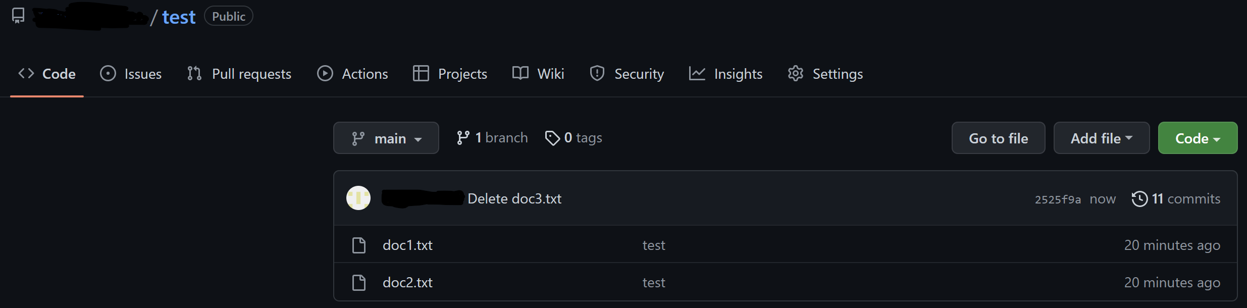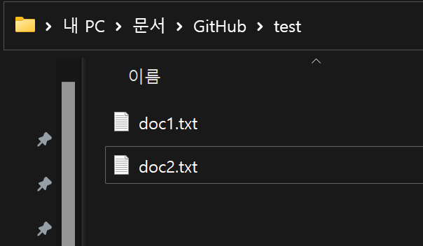 위 사진은 현재 깃허브와 내 로컬 컴퓨터의 파일 상태이다. 이 상태에서 깃허브에 doc3.txt 파일을 삭제해 보겠다.