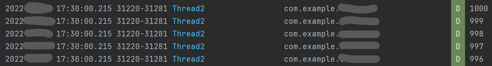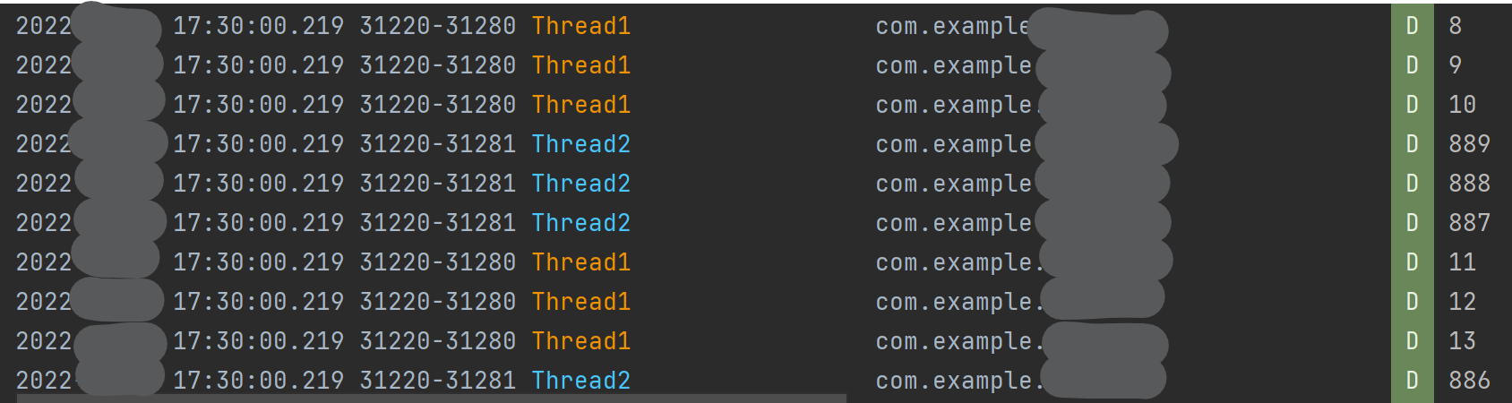 위 코드는 두 개의 Thread에서 각각 0부터 1000까지, 그리고 1000부터 0까지 로그를 찍어보는 코드이다. 이것을 실행해 보면 다음과 같다.