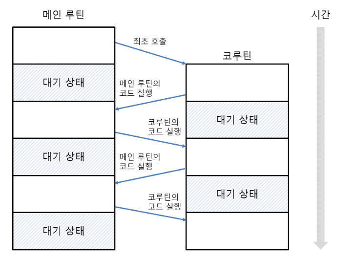 코루틴은 함수가 종료되지 않은 상태에서 메인 루틴의 코드를 실행한 뒤 다시 돌아와서 코루틴의 코드를 실행한다. 따라서 코루틴이 종료된 것이 아니게 되고 코루틴의 내용도 계속 유지된다.
