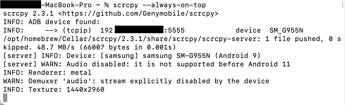 5. 마지막으로 터미널에 'scrcpy'를 실행하여 Mobile 기기화면을 노트북에 미러링 해준다