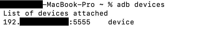 그렇다면 위와 같이 연결되었다는 메시지가 뜰 것이고 터미널에 다시 'adb devices' 를 실행해 보면 다음과 같이 연결된 기기가 표시될 것이다.