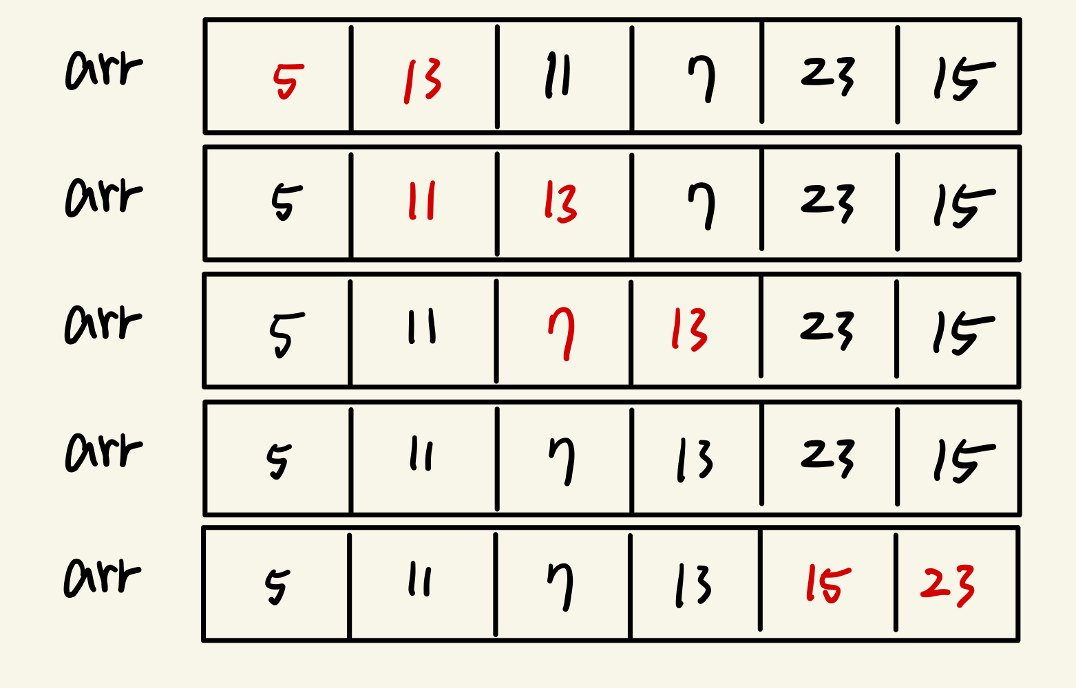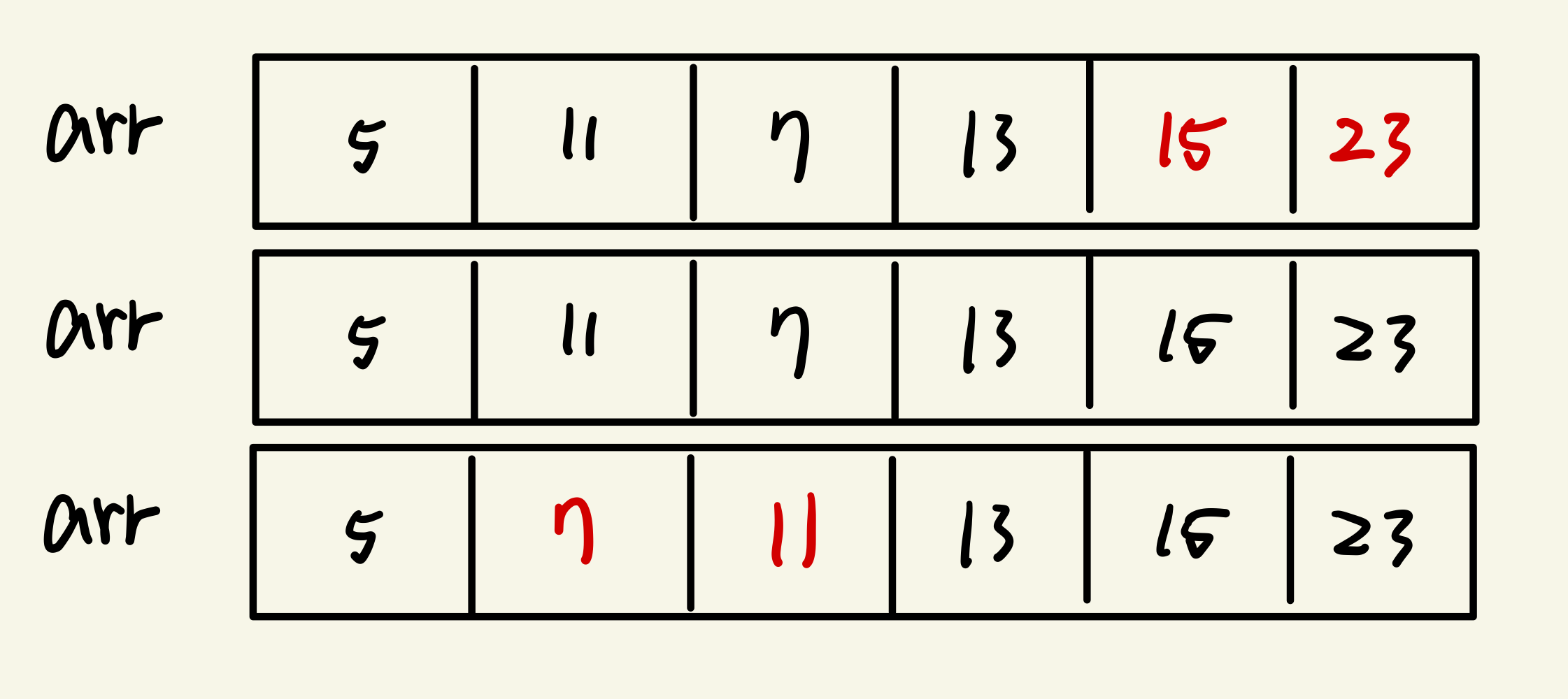 위와 같은 배열에서 정렬을 해 나아가면 다음과 같다.