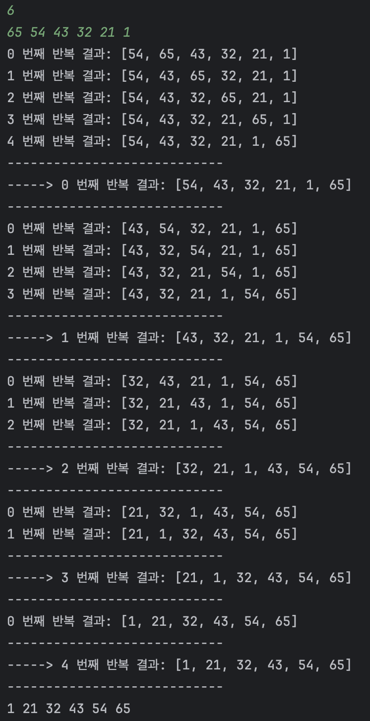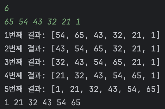 위와 같은 배열은 두번만에 정렬이 완료되었지만 내림차순으로 정렬되어 입력되었을 때는 다음과 같이 정렬될 수 있다.