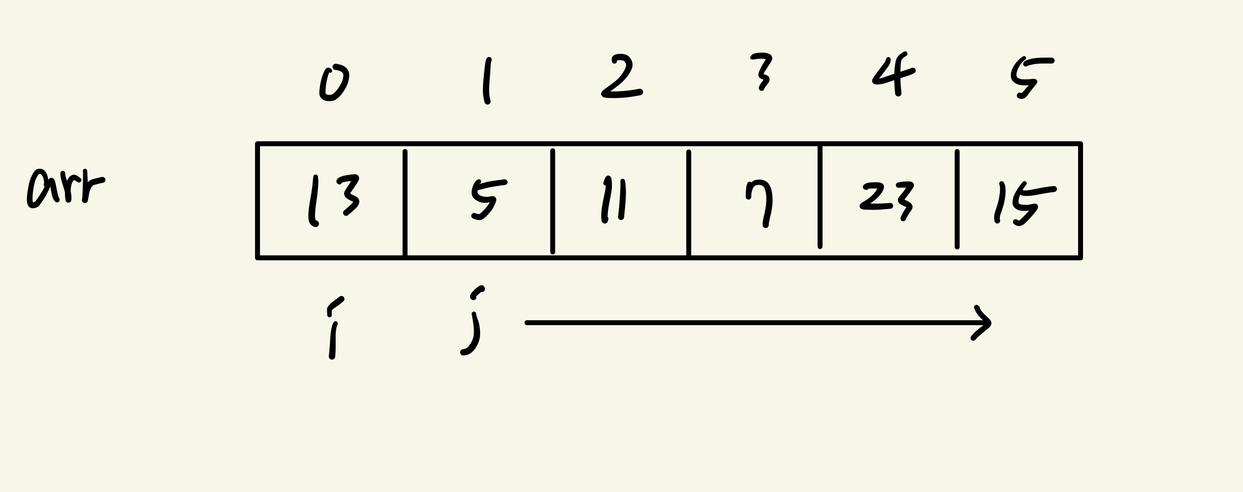 위와 같은 배열을 오름차순으로 정렬하고자 할 때 i의 index를 0에 고정하고 j의 index를 1부터 끝까지 순회하면서 가장 작은 값을 index 0에 배치한다.