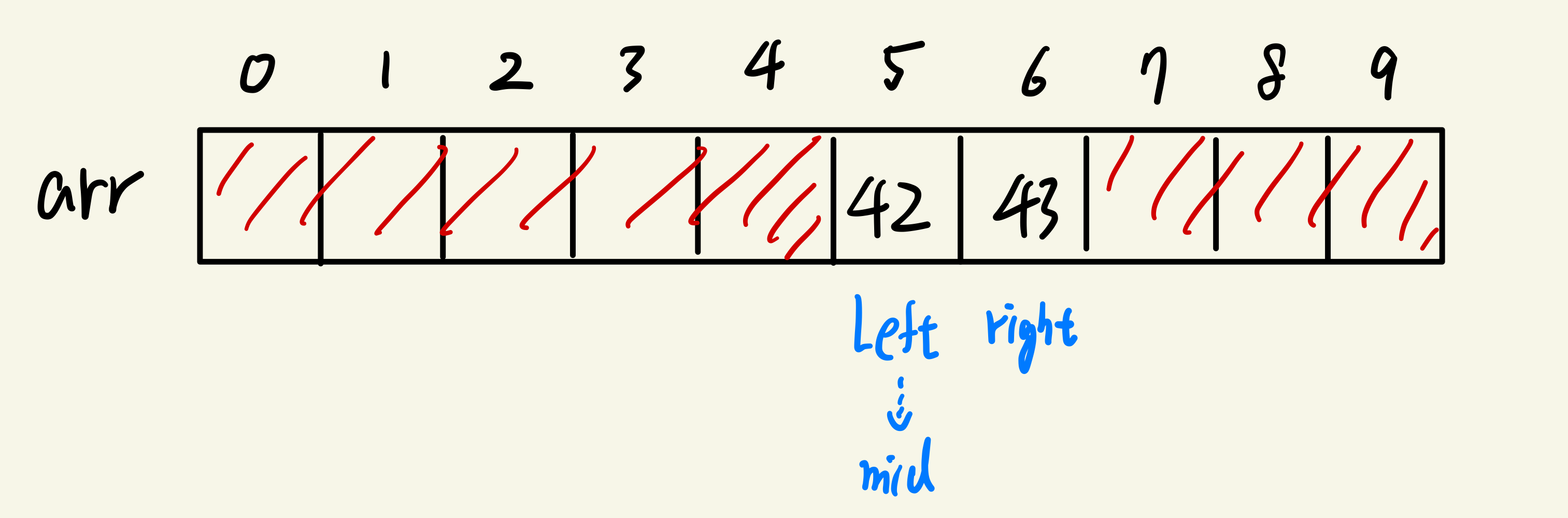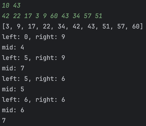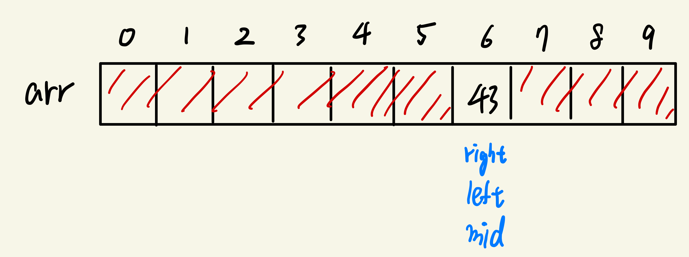 여기서 mid는 (6 + 5) / 2 = 5이므로 mid는 5가 되고 arr[5]는 43이 아니므로 left를 (mid + 1)로 할당해준다.