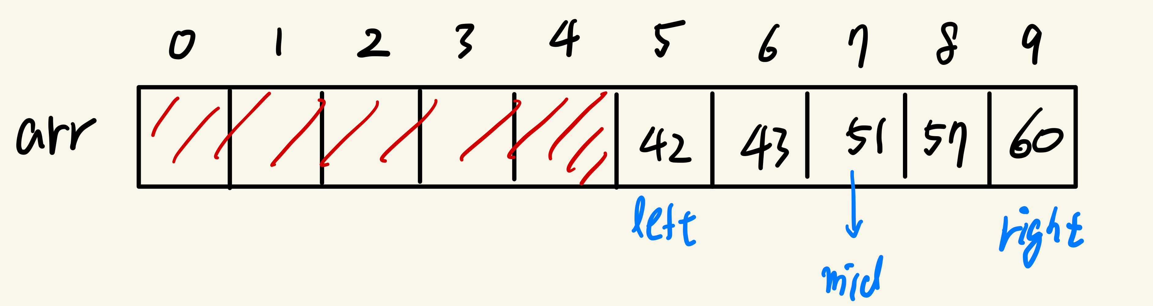 mid에 해당하는 원소가 '43'이 아니므로 left를 (mid + 1)로 할당함으로써 기존 mid index를 포함한 왼쪽은 탐색하지 않는다.