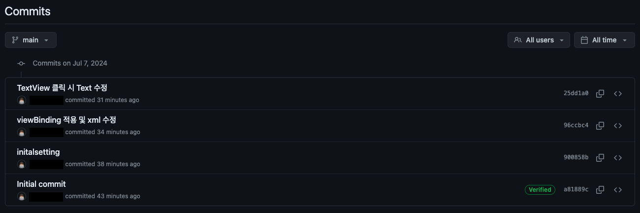 Repository안에서 Code 탭에서 Commits를 클릭하면 그동안 커밋했던 기록들이 나오게 된다.