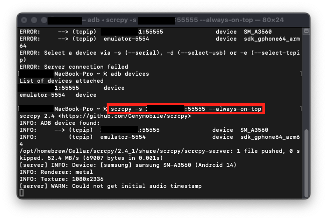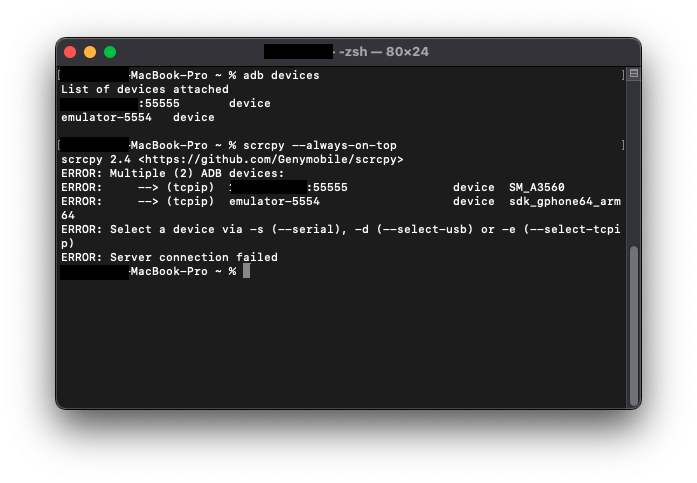 다음과 같이 여러대의 기기가 연결되어있는 경우가 있다. 이런 경우 이전 글에서처럼 단순히 scrcpy --always-on-top 을 실행하게 되면 위와 같은 에러가 나게된다. 이때에는 -s 명령어를 추가해서 하나의 기기만 미러링할 수 있다. scrcpy -s [기기 IP주소:포트번호] --always-on-top 공유하기 게시글 관리 devAndroid 저작자표시 비영리 변경금지 (새창열림)