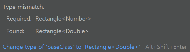 위 코드는 Rectangle<Double> 객체를 Rectangle<Number> 에 대입하는 코드이다. 이 코드는 다음과 같은 에러가 발생한다.