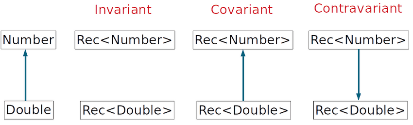 앞서 설명한 것처럼 공변성은 불변성의 반댓말이다. Number가 Double의 Super Class일 때, Rectangle<Number>가 Rectangle<Double>의 Super Class이면 이것을 공변성이라고 한다.